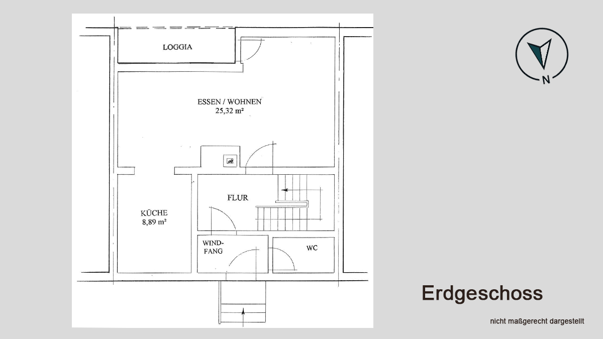 Im Erdgeschoss befindet sich die Küche, ein Badezimmer, das Wohnzimmer und ein Balkon.