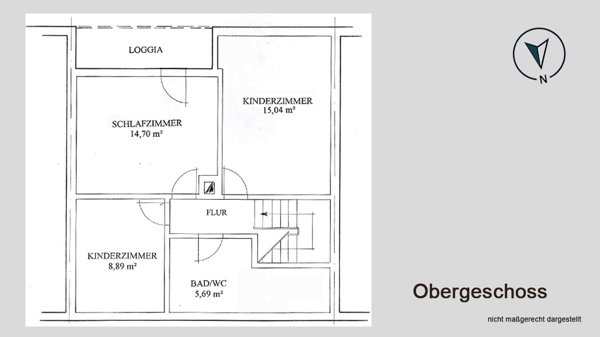 Im Obergeschoss haben wir ein Badezimmer, das Schlafzimmer, ein großes und ein kleines Kinderzimmer.